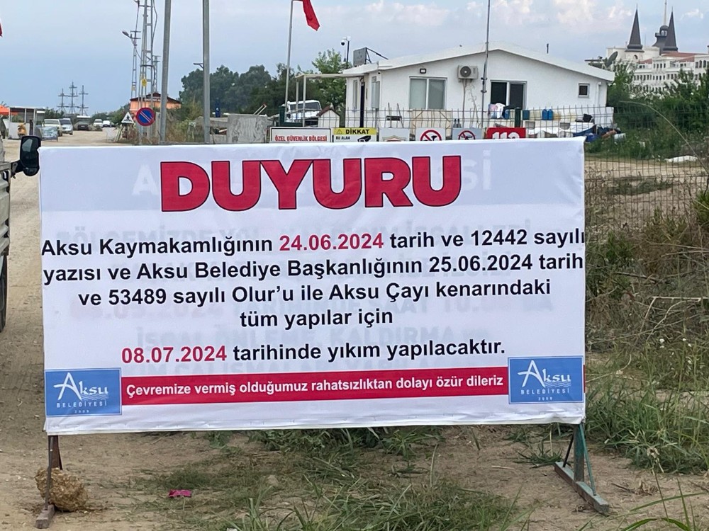 Aksu Çayı’nın denize döküldüğü yerden itibaren kaçak yapılar, görüntü ve çevre kirliğine neden olan yapılar için, 8 Temmuz 2024 tarihinde yıkım kararı alındı.