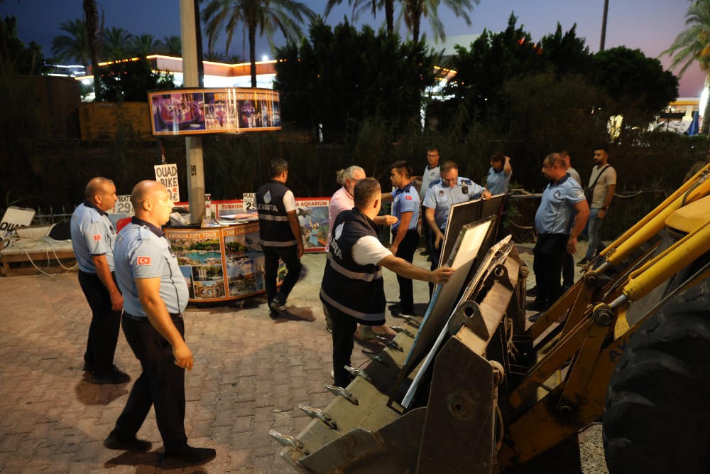 Aksu Belediyesi Zabıta ve Yapı Kontrol Müdürlüğü ekipleri, Antalya Büyükşehir Belediyesi Zabıta Müdürlüğü ekipleri ile birlikte, Kemerağzı Mahallesi Oteller Bölgesi sahil şeridinde dilenci, seyyar satıcı ve kaldırım işgali denetimi yaptı.