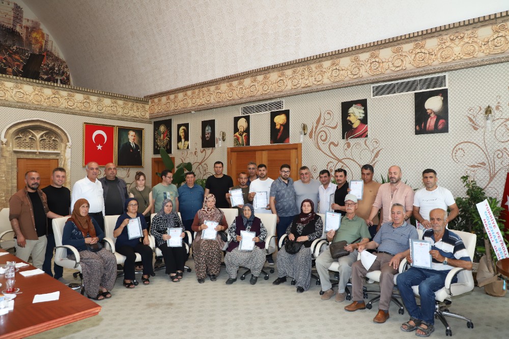 Aksu Belediyesi; Pınarlı, Cihadiye ve Çamköy Mahalle’lerindeki mülkiyet problemlerinin çözüme kavuşturulmasının ardından başvuru sürecini tamamlayan hak sahibi 15 vatandaşa tapularını teslim etti.