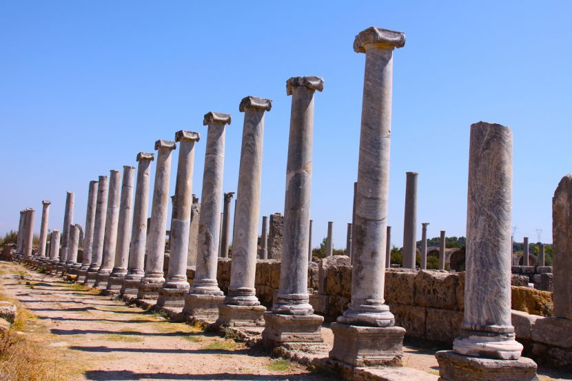 Antalya‘nın 18 km doğusunda, Aksu ilçesi sınırları içinde bulunan, bir zamanlar Pamfilya Bölgesine başkentlik yapmış antik bir kenttir. Şehirdeki Akropolis’ in Tunç Çağı döneminde kurulduğu düşünülmektedir. Helenistik dönem boyunca şehir eski dünya içerisindeki en zengin ve güzel şehirler arasında sayılmaktadır. Ayrıca Yunan matematikçi Pergeli Apollonius‘ un memleketidir. Türkiye’de çıkan en güzel ve bozulmamış heykeller bu bölgeden çıkmakta sanat ve ticaret yönünden çok gelişmiş bir şehir merkezi olduğu düşünülmektedir.