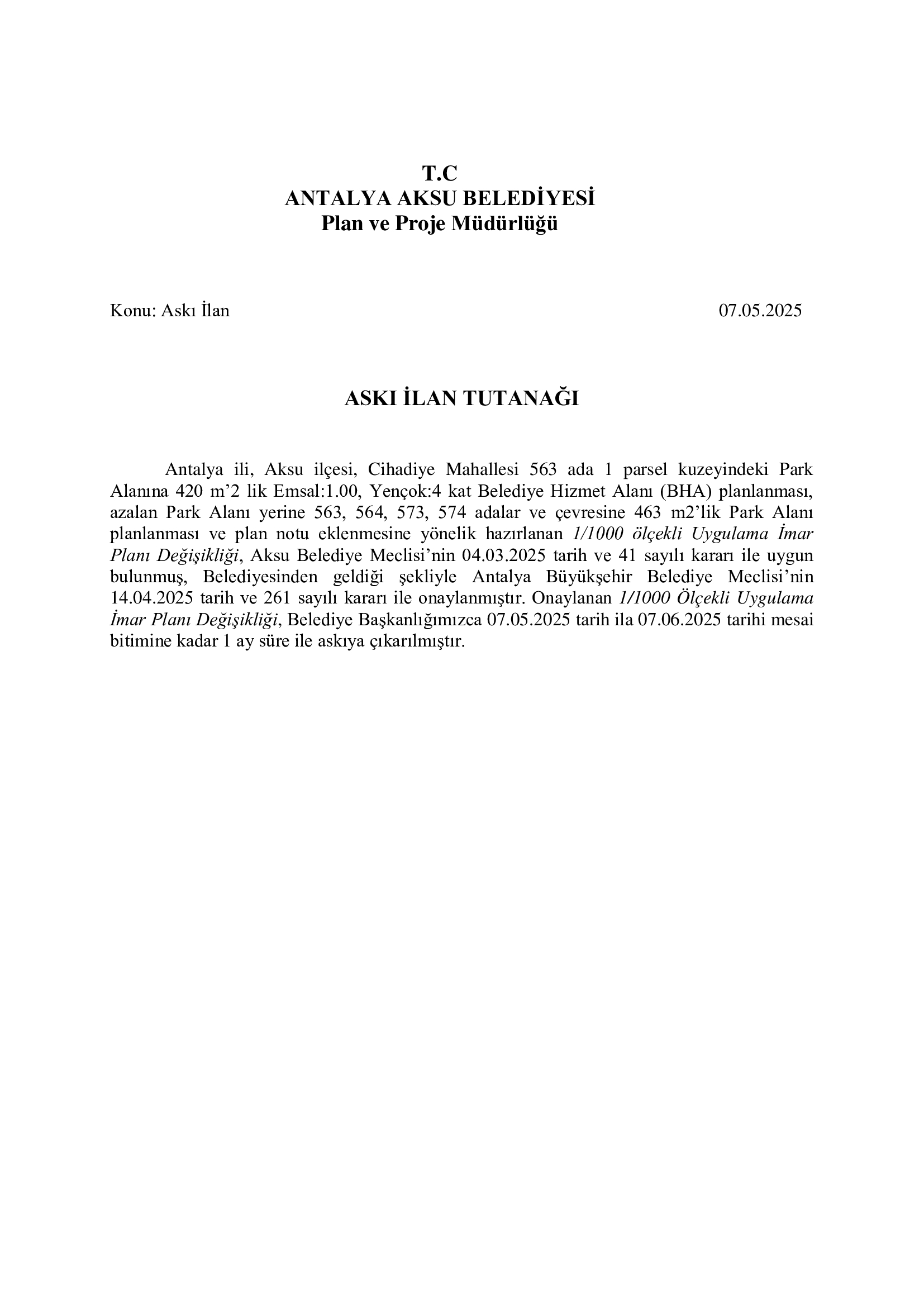 - PLAN VE PROJE MÜDÜRLÜĞÜ -CİHADİYE MAHALLESİ 563 ADA 1 PARSEL KUZEYİNDEKİ PARK ALANINA BHA PLANLANMASI HK. ASKI İLANI