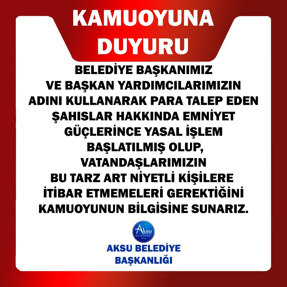 Aksu Belediye Başkanı İsa Yıldırım, Başkan Yardımcıları, Meclis Üyeleri ve bürokratların adını kullanarak, para talep eden art niyetli kişilere karşı vatandaşlar uyarıldı.