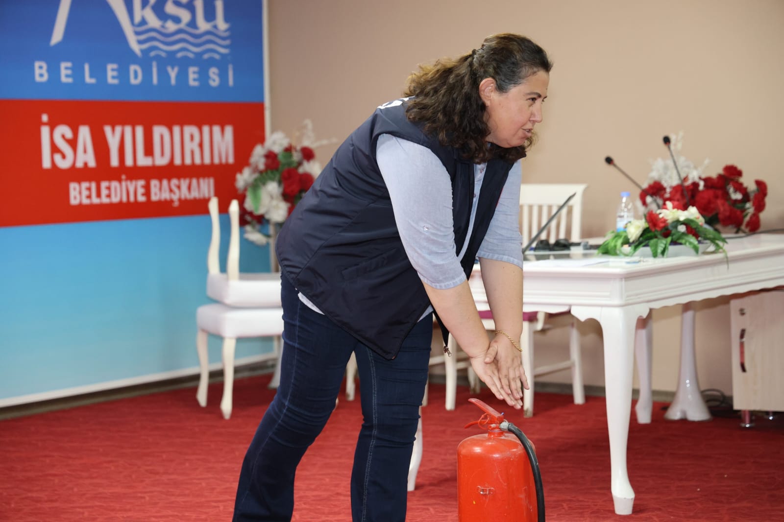 Aksu Belediyesi İnsan Kaynakları ve Eğitim Müdürlüğü tarafından belediye personeline 'Yangın Eğitimi, Tahliye ve Yangın Söndürme Tatbikatı' eğitimi verildi.
