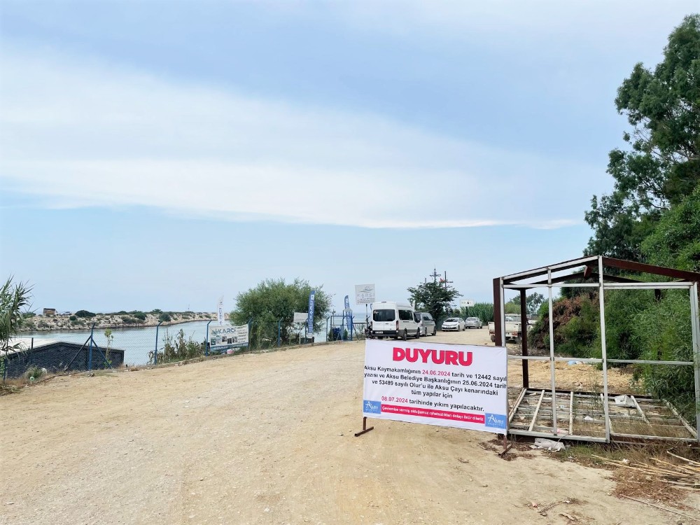 Aksu Çayı kenarında, görüntü ve çevre kirliğine neden olan; ahşap ve çelik iskeleler, prefabrik, konteyner, yüzen restoran ve benzeri tarzı kaçak yapılar, Aksu Kaymakamlığının 24.06.2024 tarih ve 12442 sayılı yazısı doğrultusunda kaldırılacak.