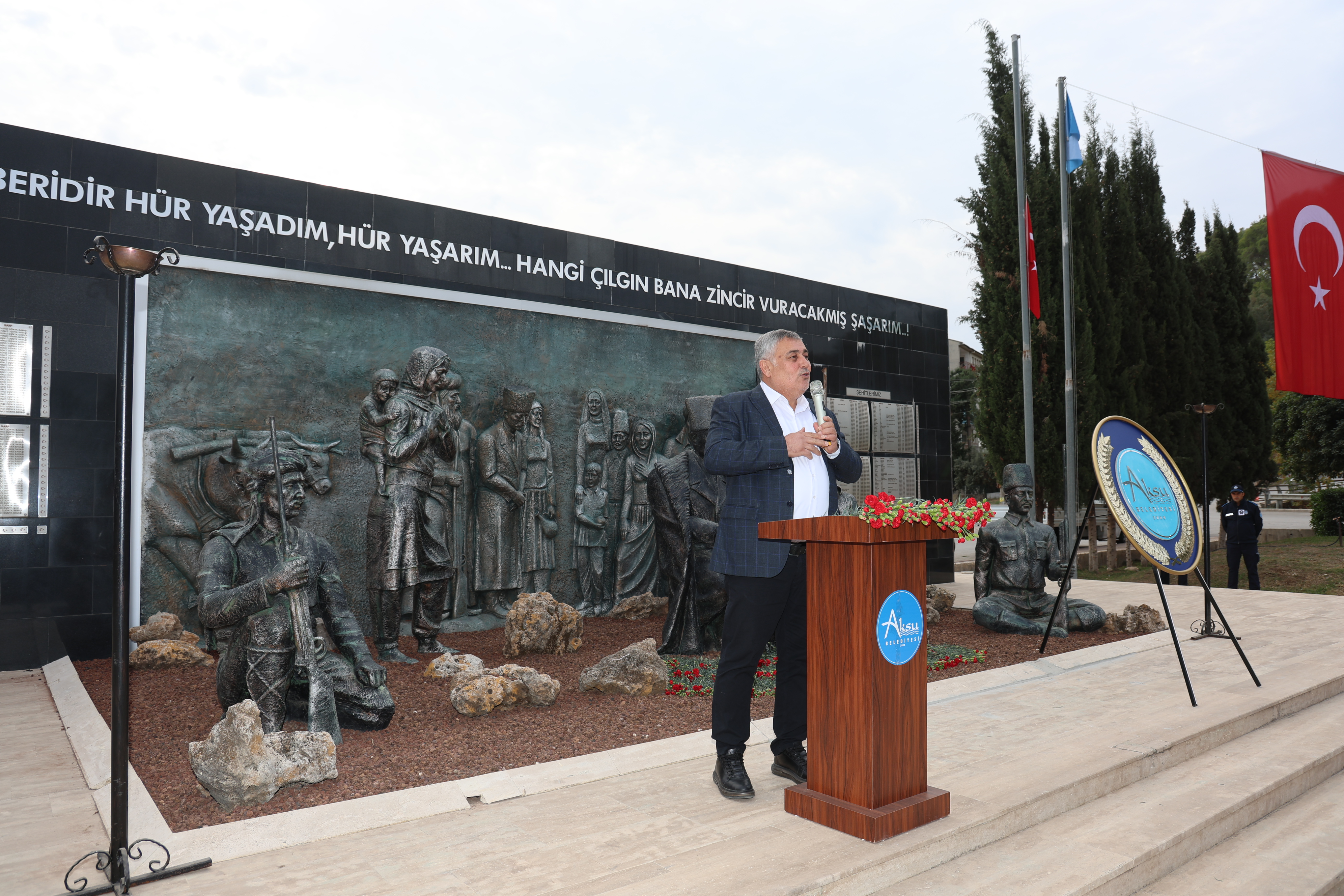 Tören; Aksu Belediye Başkanı İsa Yıldırım'ın Atatürk Anıtı’na çelenk sunmasıyla başladı. Saat 09.05’te çalan siren sesiyle 2 dakikalık saygı duruşunda bulunuldu. Saygı duruşunun ardından okunan İstiklal Marşı’yla birlikte bayraklar yarıya indirildi. Başkan Yıldırım törende yaptığı konuşmada şunları söyledi;