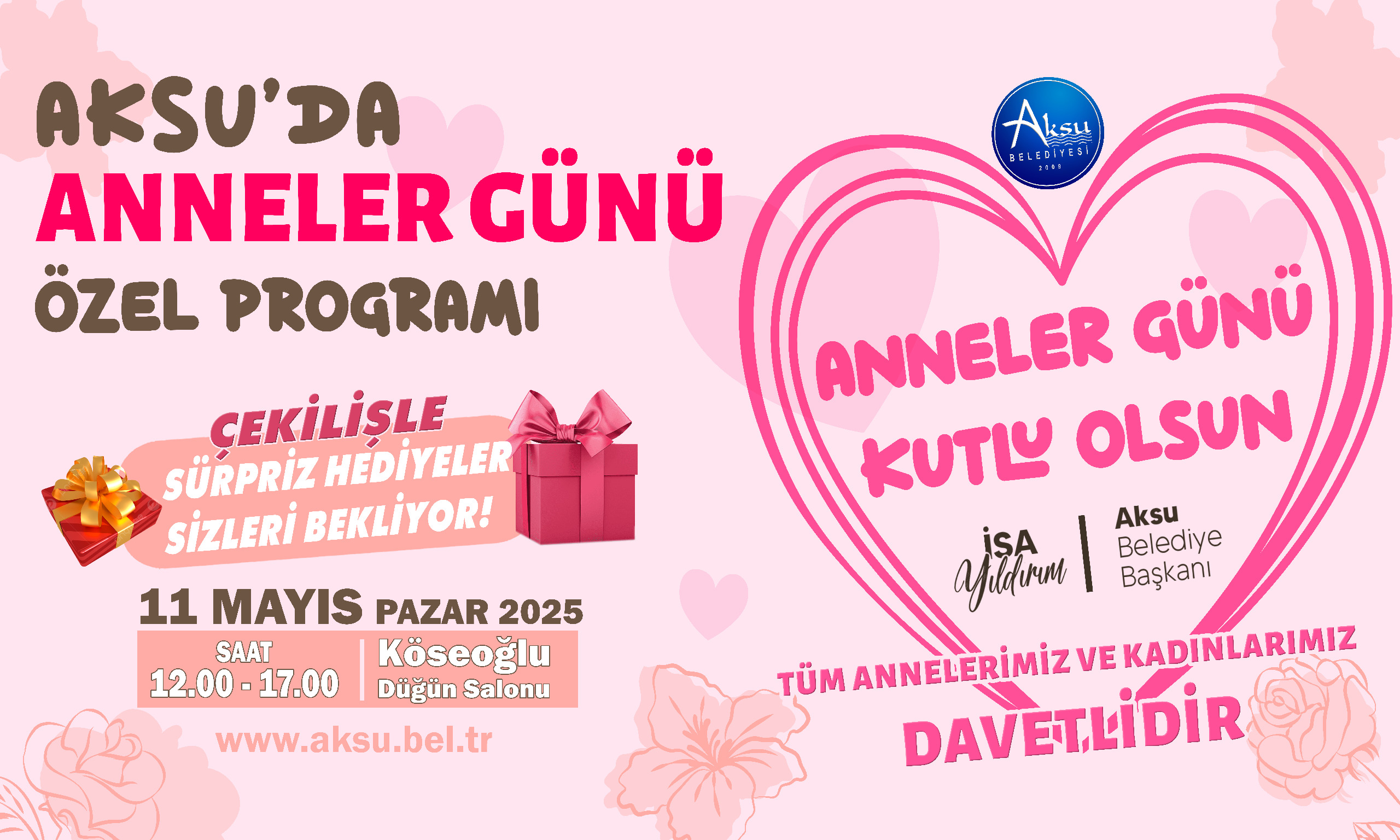 “Çocuklarını aylarca bedenlerinde taşıyan, onları karşılıksız sevgileriyle büyüten, hayatın her aşamasında dua ve desteklerini esirgemeyen annelerimizin haklarını ödeyebilmemiz mümkün değil. Annelerimiz, hoşgörünün, karşılıksız özverinin, sevgi ve şefkat duygularının tükenmez kaynağıdır. Onlar; fedakârlıkları, sevgileri ve sabırlarıyla yalnızca ailenin değil, toplumların da güç kaynağıdır. Ulu Önder Gazi Mustafa Kemal Atatürk'ün; ‘Bu millet esas terbiyesini aileden almaktadır. Türk milleti öyle analara sahiptir ki her devrin büyük adamlarını bu analar yetiştirmiştir. Türk kadını daha büyük nesiller yetiştirmeye kabiliyetlidir’ sözü annelerimizin toplumumuzdaki önemini en iyi şekilde ifade etmektedir. Biz de bu özel günde annelerimize olan sevgimizi bir kez daha dile getirmek amacıyla onlara özel bir program hazırladık. Kültür ve Sosyal İşler Müdürlüğümüz tarafından tertip edilen “Anneler Günü Özel” programımız 11 Mayıs Pazar günü saat 12.00-17.00 arasında Aksu Köseoğlu Düğün Salonu’nda gerçekleştirilecek. Tüm annelere ve anne adaylarına yönelik programımız sürpriz hediyeler ve çeşitli etkinliklerle dolu olacak. Tüm kadınlarımızı, bu anlamlı programa bekliyoruz.