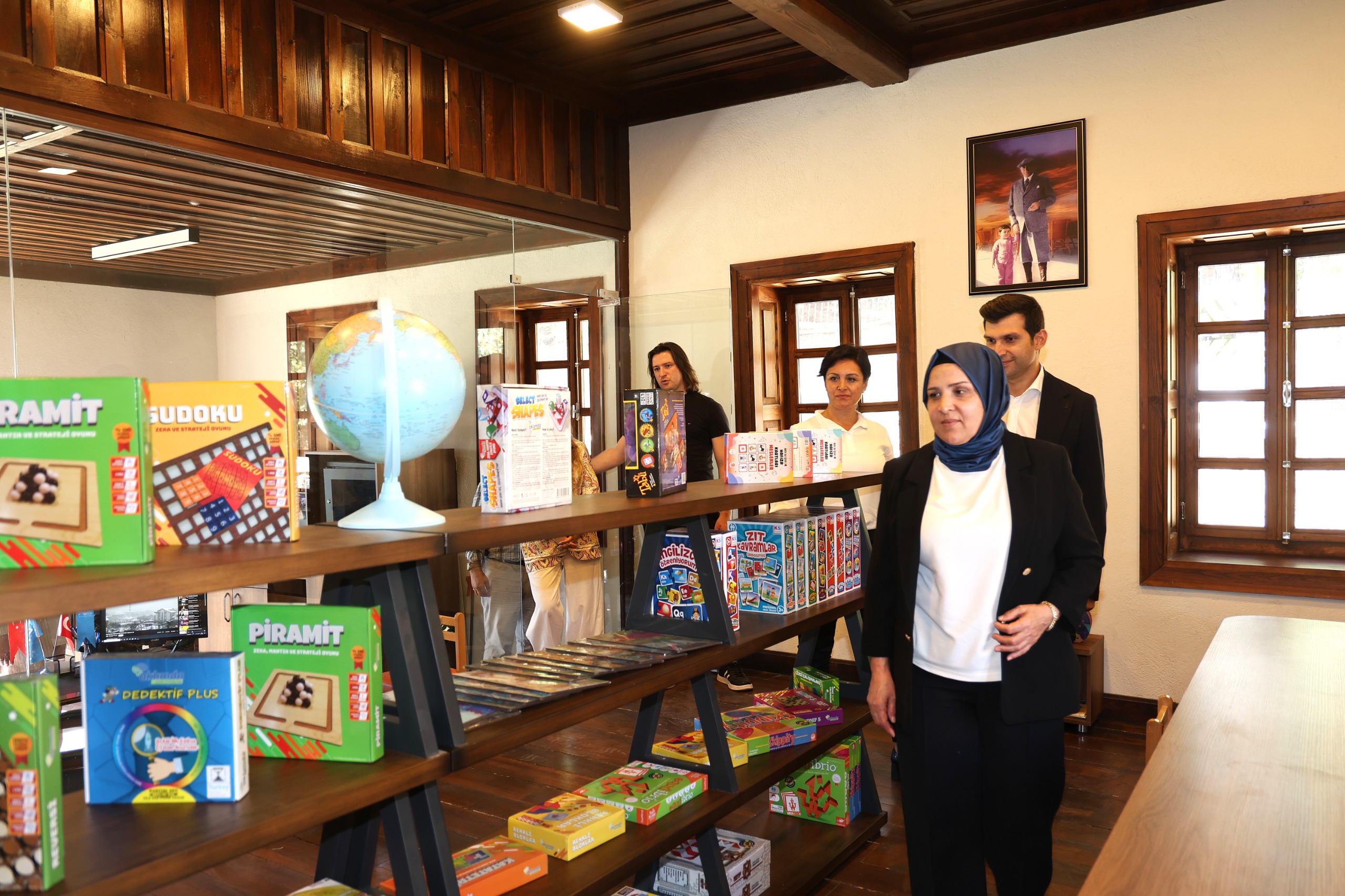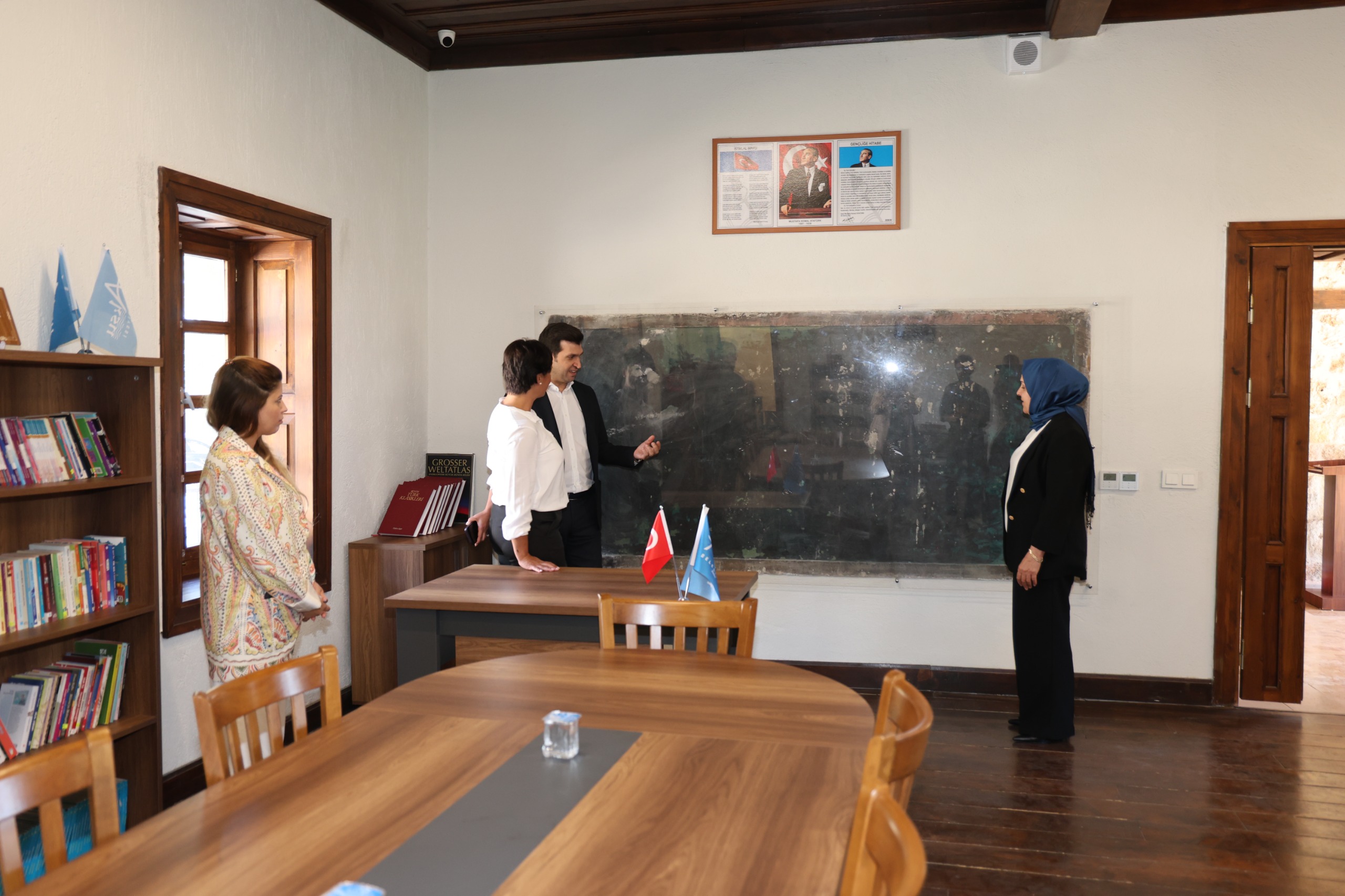 Kütüphanede yapılan yeni düzenlemeler hakkında bilgi alan Emine Yıldırım ve Başkan Yardımcısı Mehmet Atalay, tarihi kara tahtayı ve Kültür ve Sosyal İşler Müdürlüğü tarafından oluşturulan Akıl Oyunları Köşesi’ni yakından inceledi.